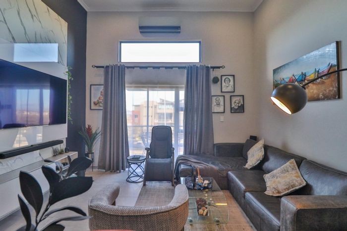 Beachside living steps from Bloubergstrand’s shore, cafes and kitesurfing; modern open-plan apartment with sunlit interiors and two en-suite bedrooms, plus open parking.