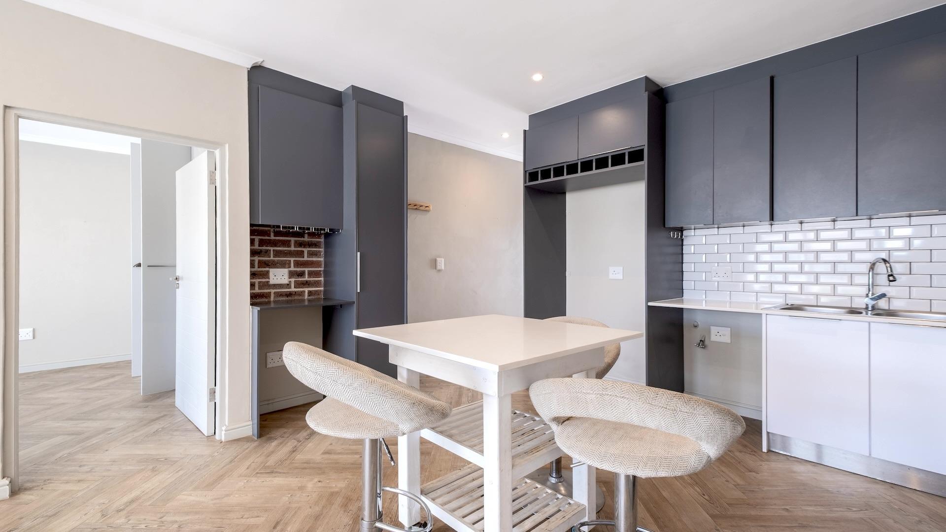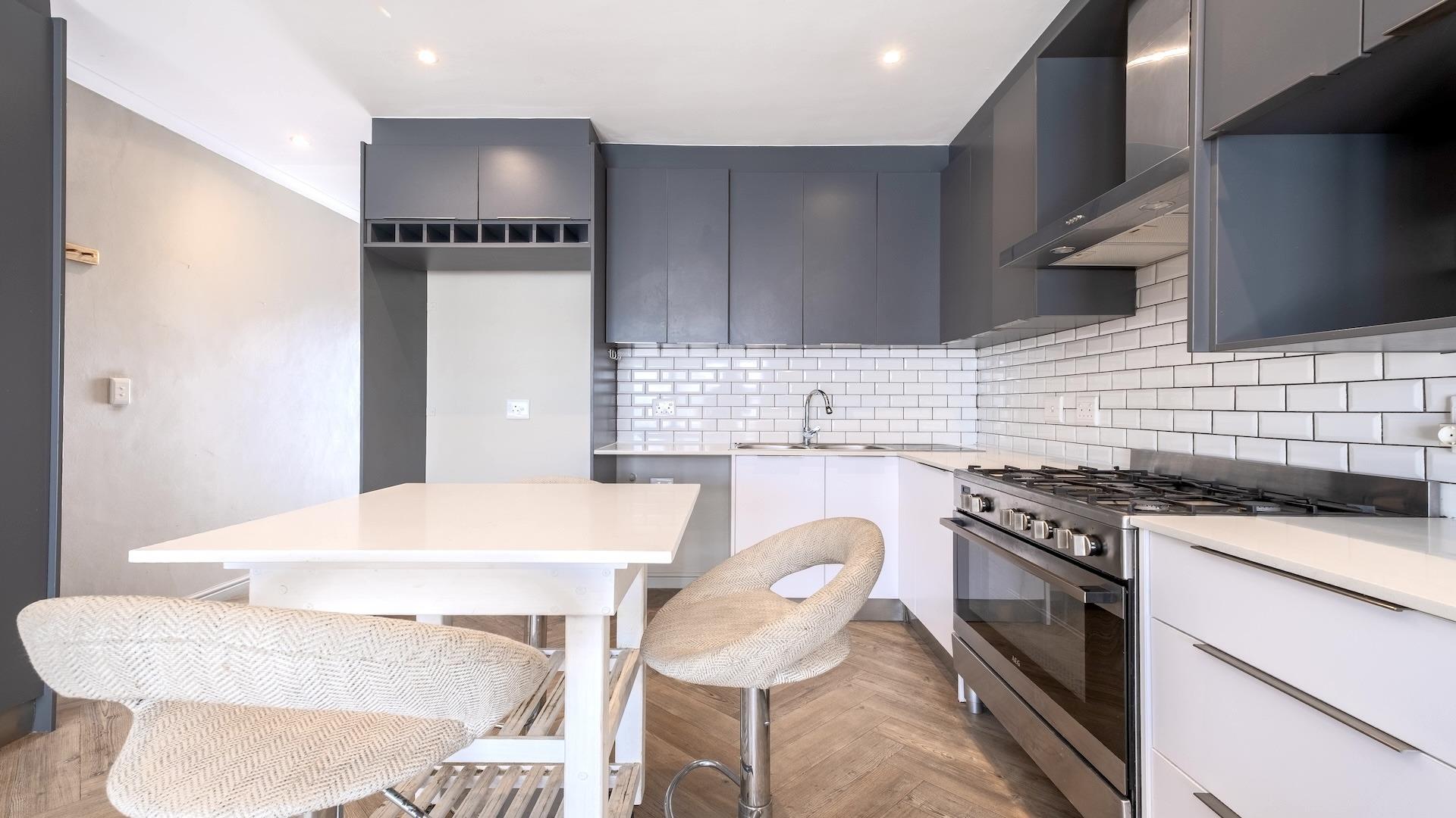 The property comprises two generously sized bedrooms and two modern bathrooms. The open-plan lounge and dining area creates a welcoming living space and connects effortlessly to a sleek, fully equipped kitchen featuring a gas hob, ample built-in cupboards, and a plumbing point for a dishwasher. An additional plumbing point is located in the garage for added convenience.