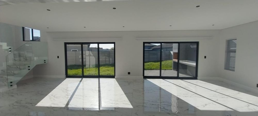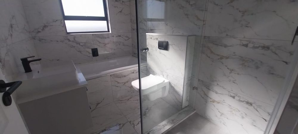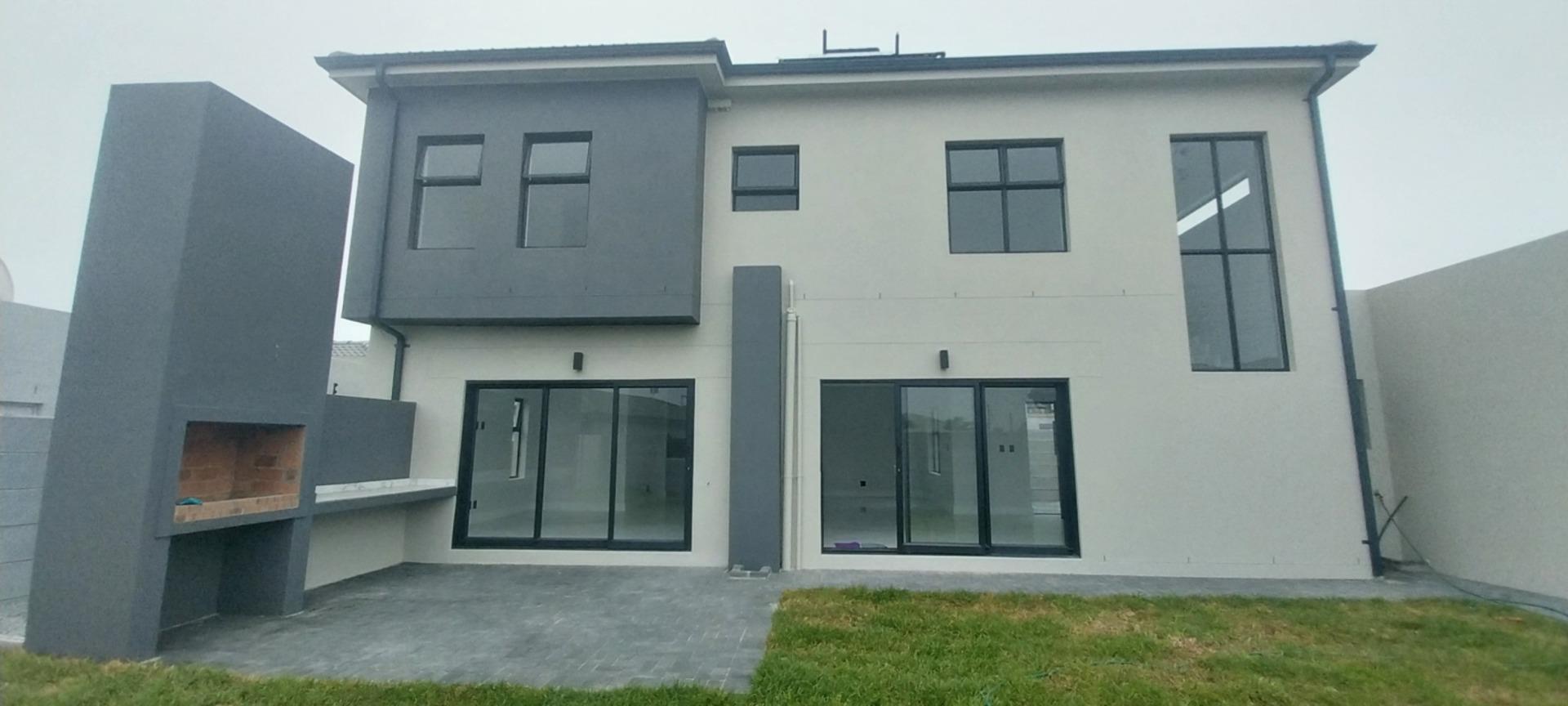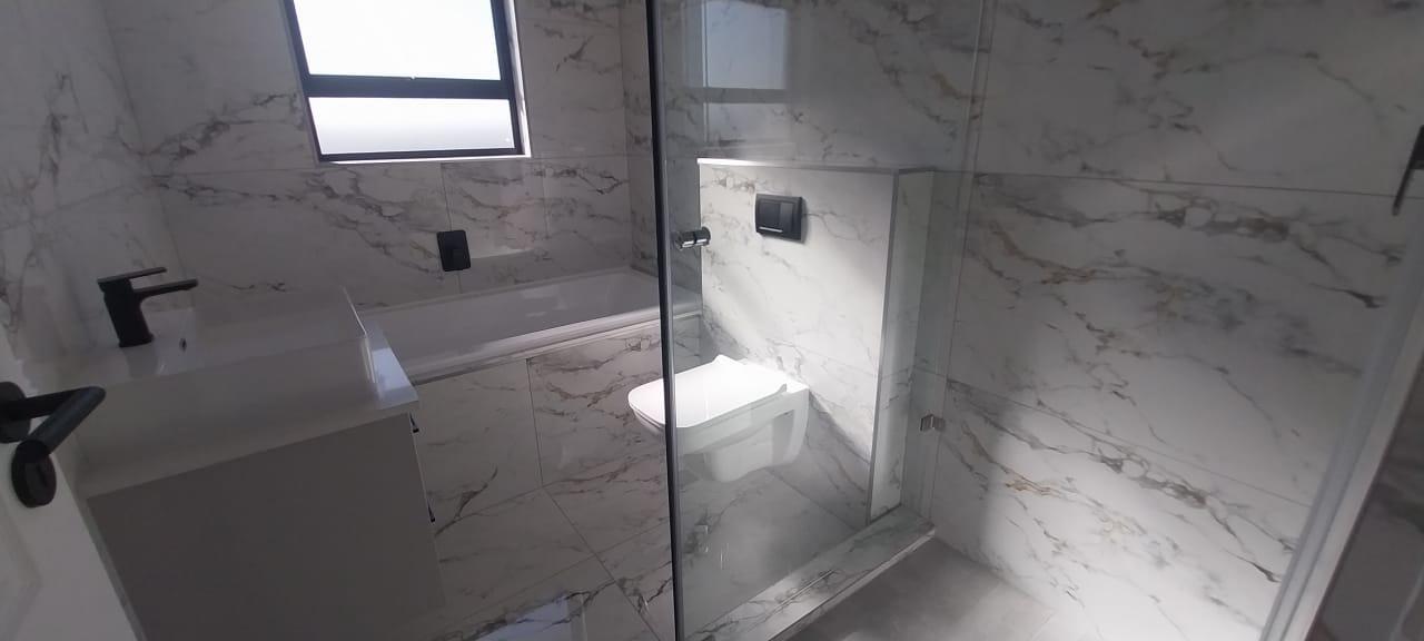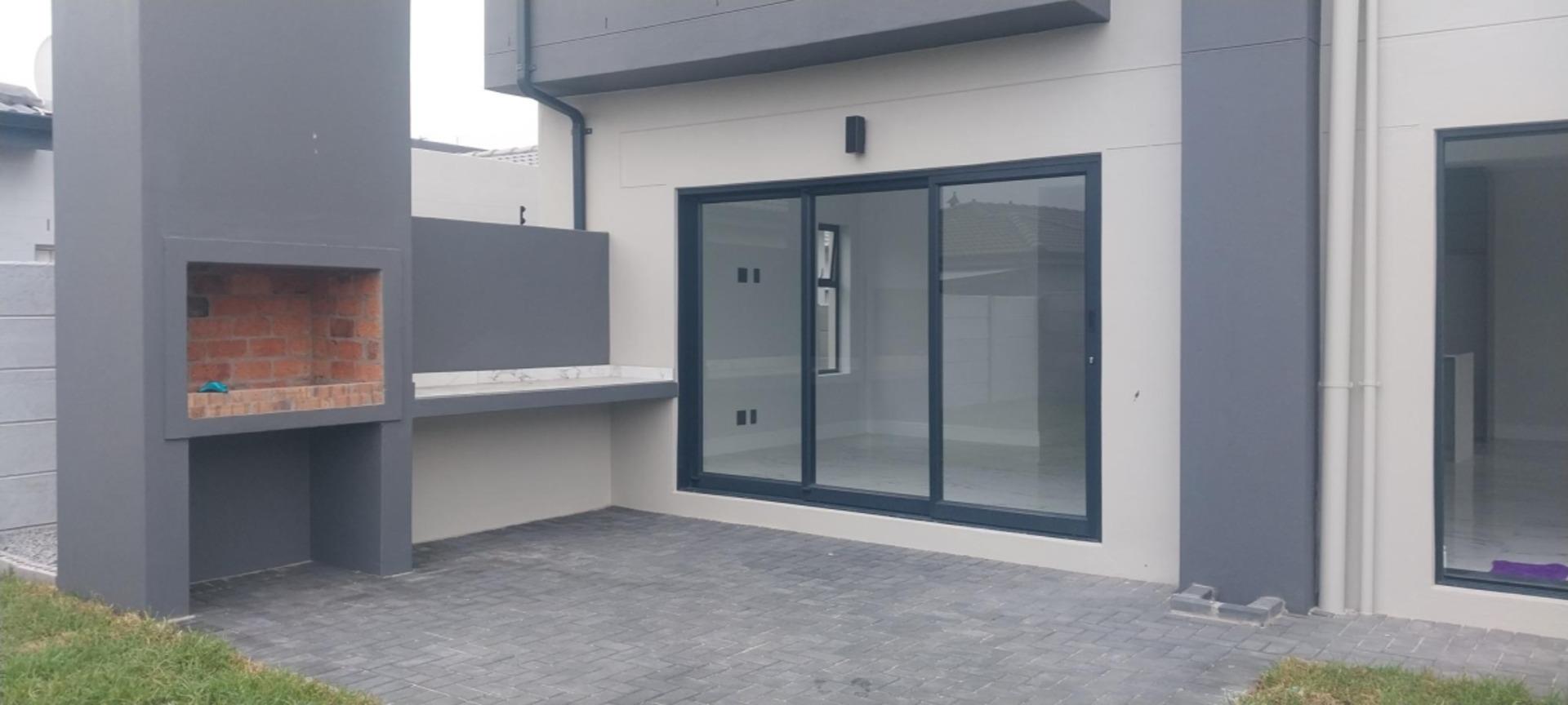 Welcome to your dream double-storey home, boasting elegance, comfort, and functionality. This spacious residence offers three bedrooms, all conveniently located upstairs for privacy, with one bedroom featuring en suite bathroom. Additionally, there's a shared family bathroom. Downstairs, you'll find a generous lounge area with double sliding doors that seamlessly connect to a covered braai and entertainment space, overlooking the lush garden. The kitchen is equipped with modern amenities, including a gas hob, and is complemented by a separate scullery/laundry room for added convenience. Throughout the home, luxurious marble tiles adorn the floors, adding a touch of sophistication to every corner throughout the house