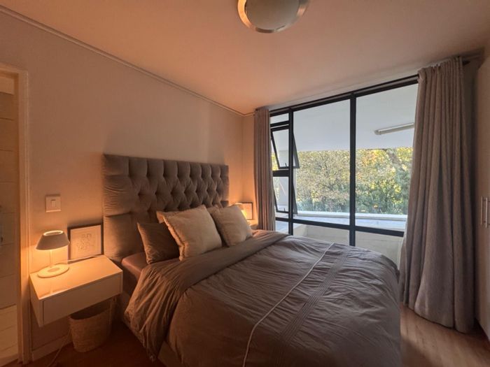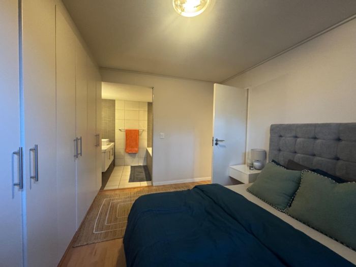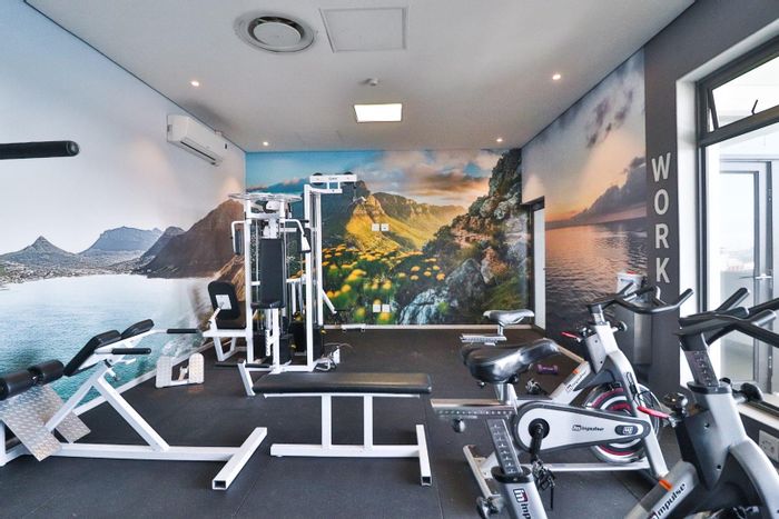 Two-bedroom, one-bathroom apartment, 72 m², fully furnished, with views of Table Mountain and amenities including a gym and pool.