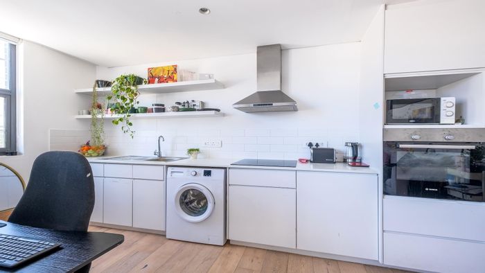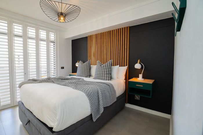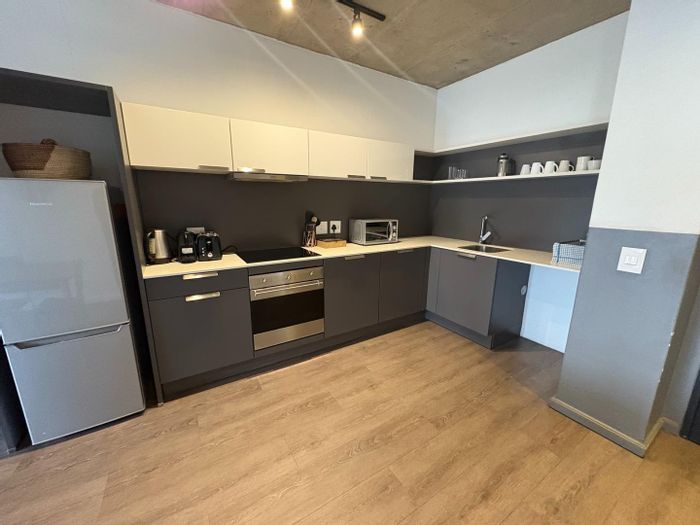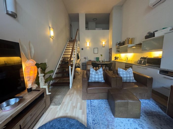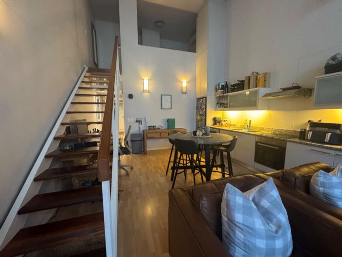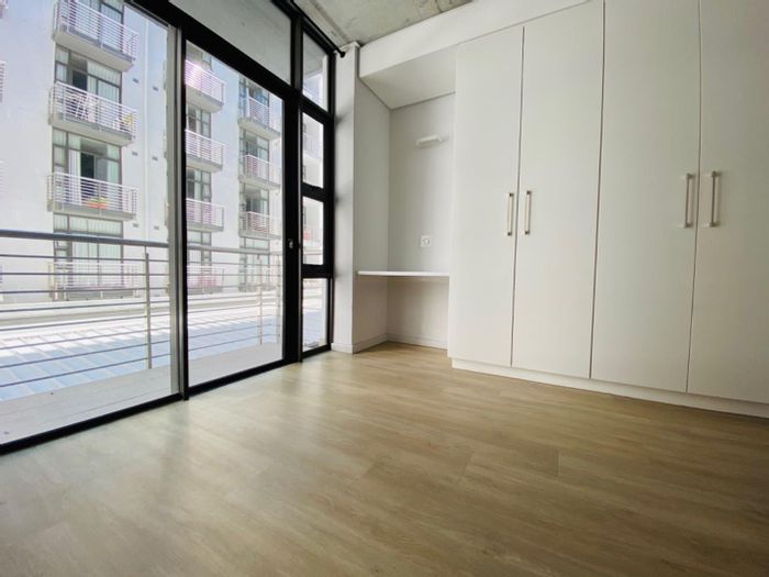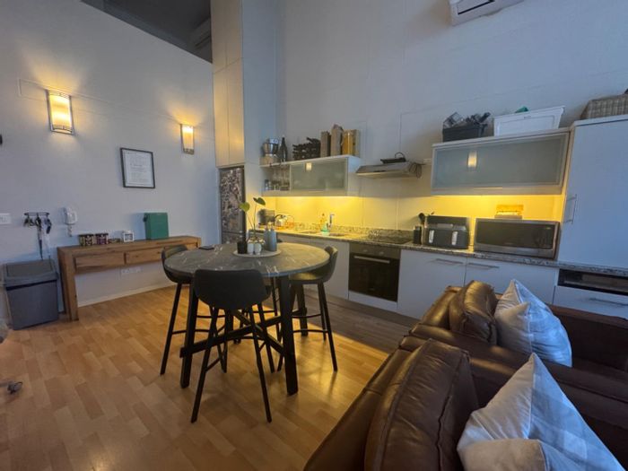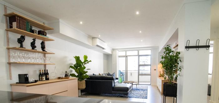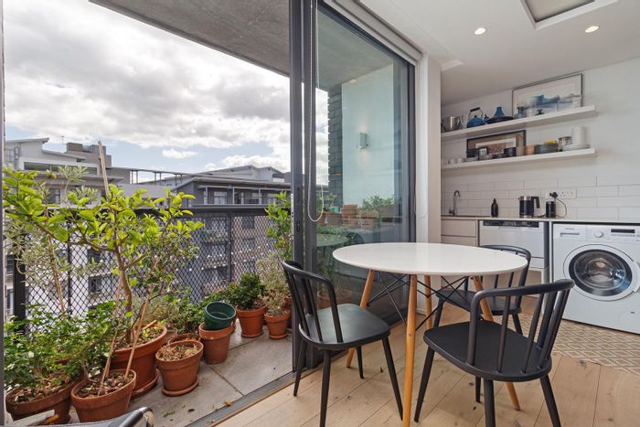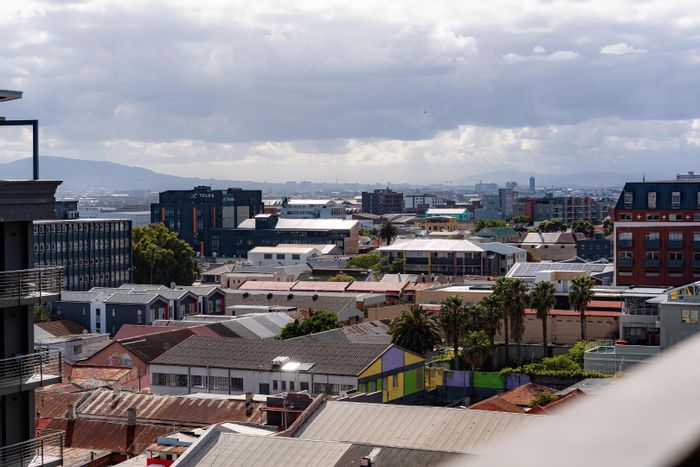 City edge Woodstock living with iconic Table Mountain views from a top-floor sunlit open-plan apartment; premium wooden floors and air-conditioning, one bedroom, one bath, minutes from Cape Town City Centre.