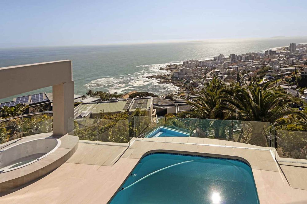 The main living area on this level is a design masterpiece. Revel in a bespoke lounge with custom cabinetry, a wet bar ideal for entertaining, and a seamless flow into the state-of-the-art kitchen. The kitchen boasts marble countertops, built-in appliances, a glass-display wine cellar, and two distinct cooking areas. The scullery and dual laundry rooms enhance the home's functionality. Outdoor living reaches new heights with an entertainment area, pool, and jacuzzi framed by the most spectacular views in Bantry Bay, stretching across Robben Island and beyond.