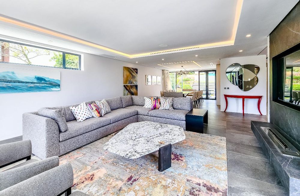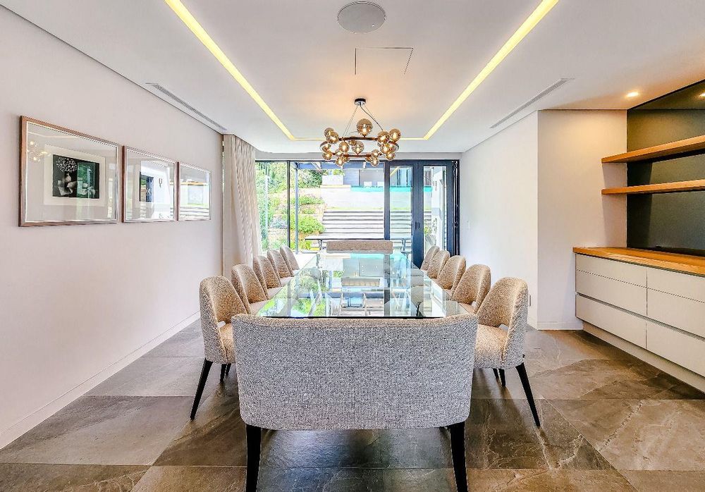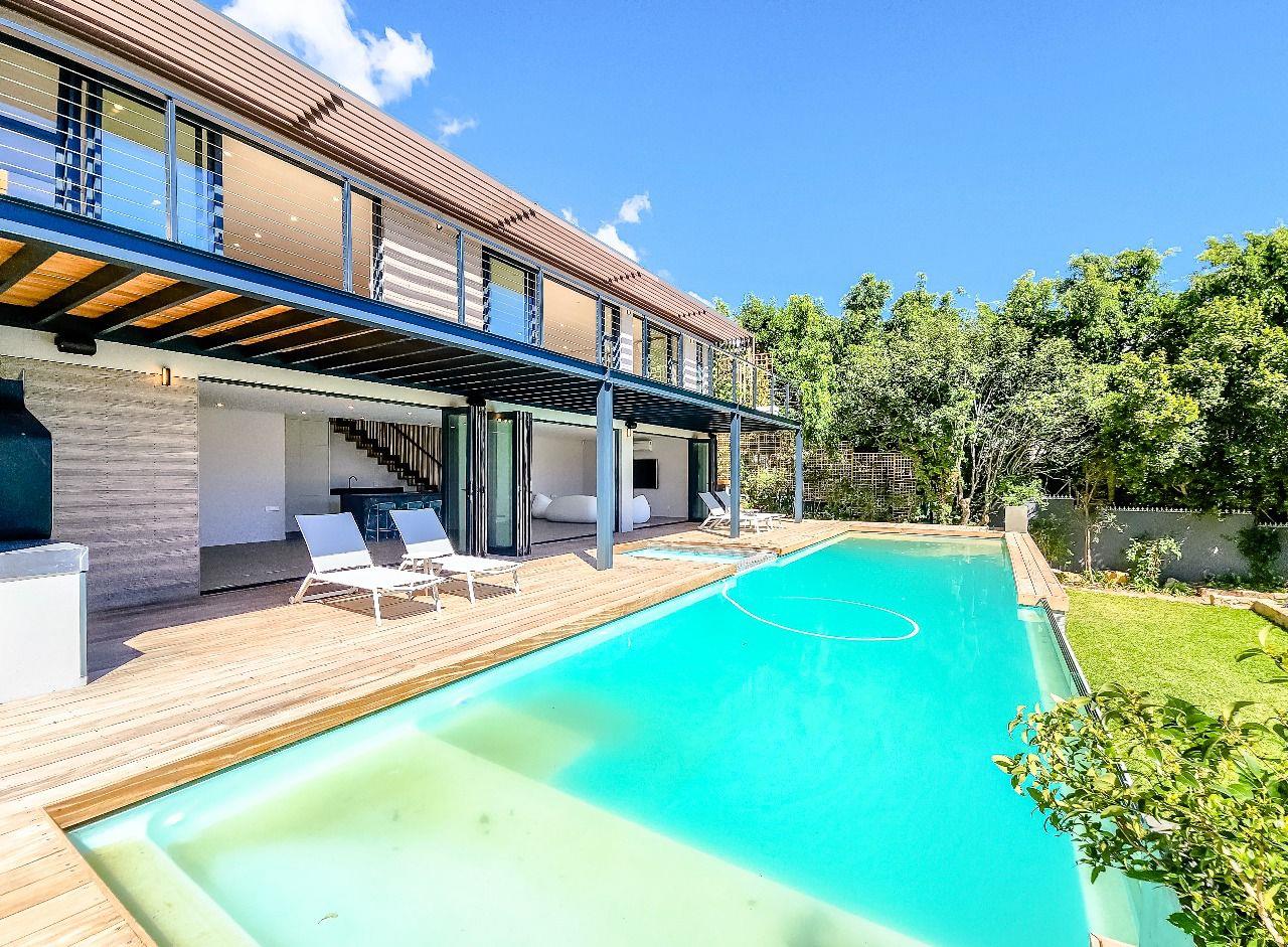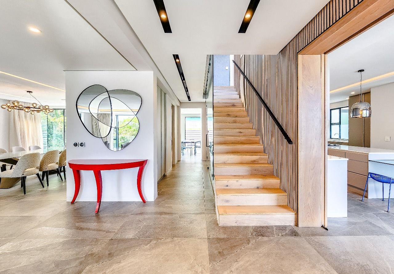 Outdoors, the property showcases not one, but two spectacular pools. The main house features a serene, sun-soaked pool oasis, while the dramatic double-storey pool house is built for grand-scale entertaining. Think: a 25-metre lap pool, a gourmet braai pavilion, and an upper-level lounge that transforms into your own private nightclub under the stars.