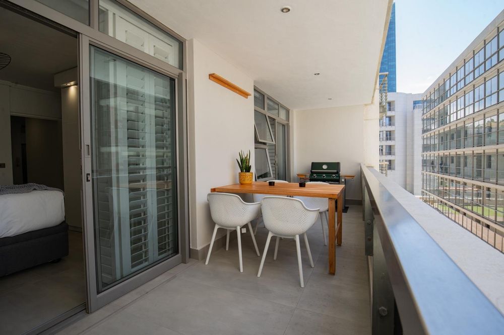 Open-plan living and dining area leading to a private balcony with collapsible built-in table – perfect for entertaining or working al fresco