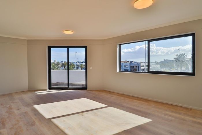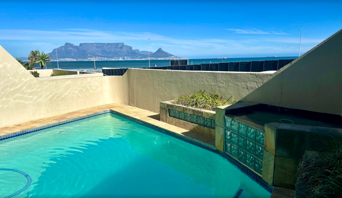 Beachside living steps from Blouberg shoreline, cafes and kitesurfing; light-filled corner apartment with exclusive paved garden and Table Mountain/ocean views — three bedrooms, two baths, two garages.